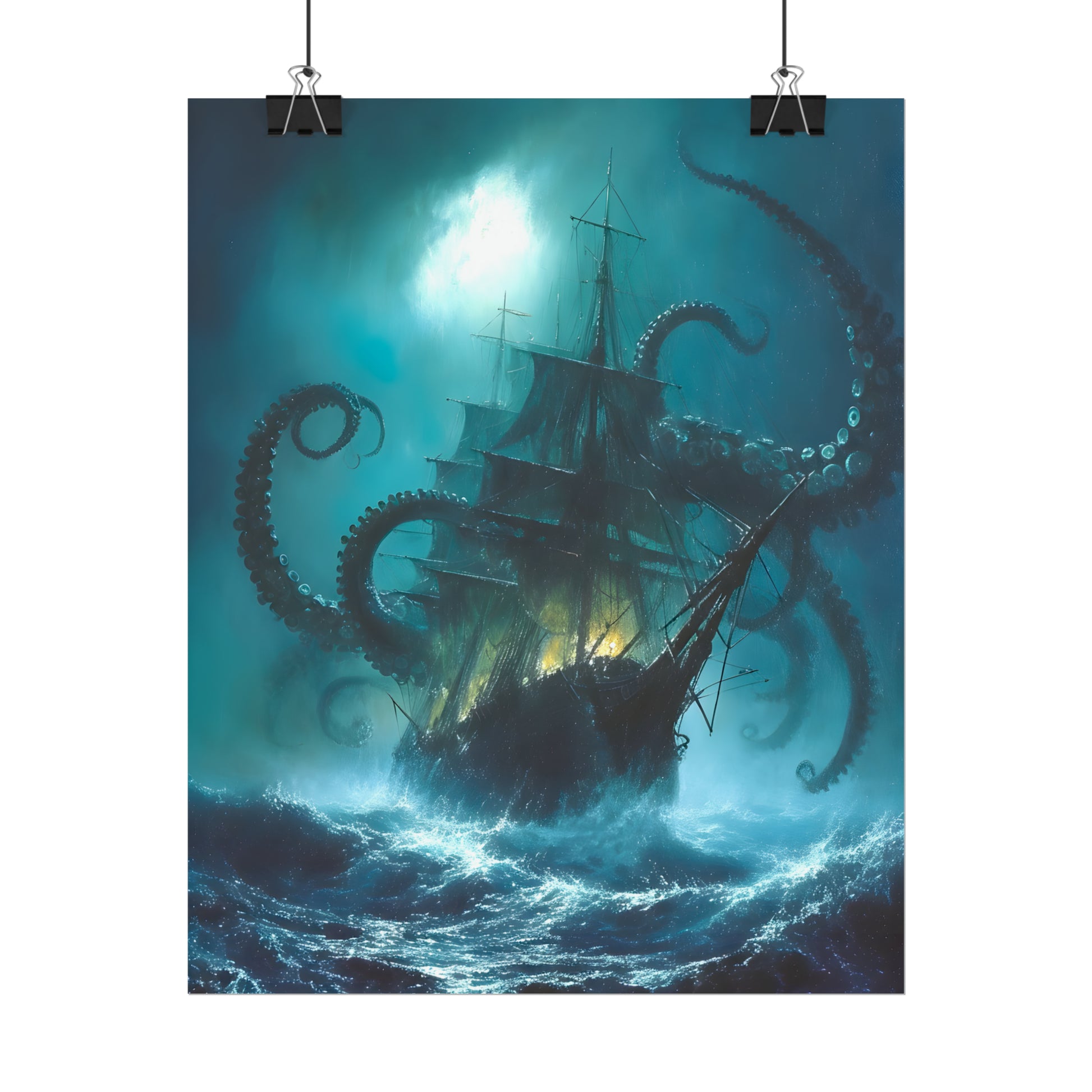 Introducing our dramatic "Battle with the Depths" poster, featuring a mesmerizing oil painting print that brings the epic clash between a majestic sailing ship and a fearsome Kraken to life. This stunning artwork captures the intense moment when the monstrous Kraken's massive tentacles emerge from the sea reaching skyward to entangle the vessel in a gripping struggle.