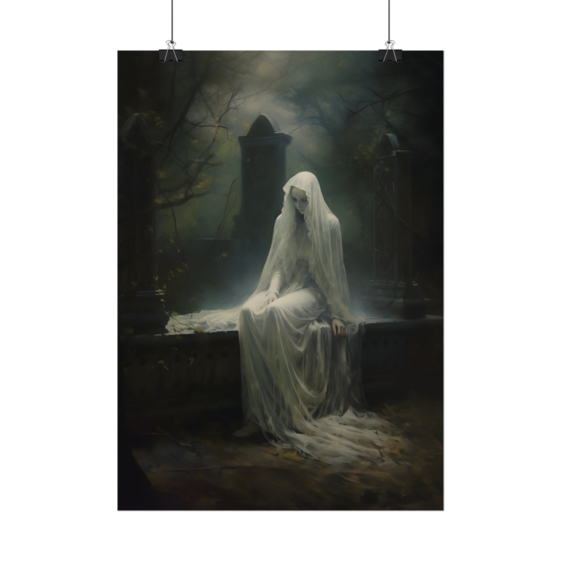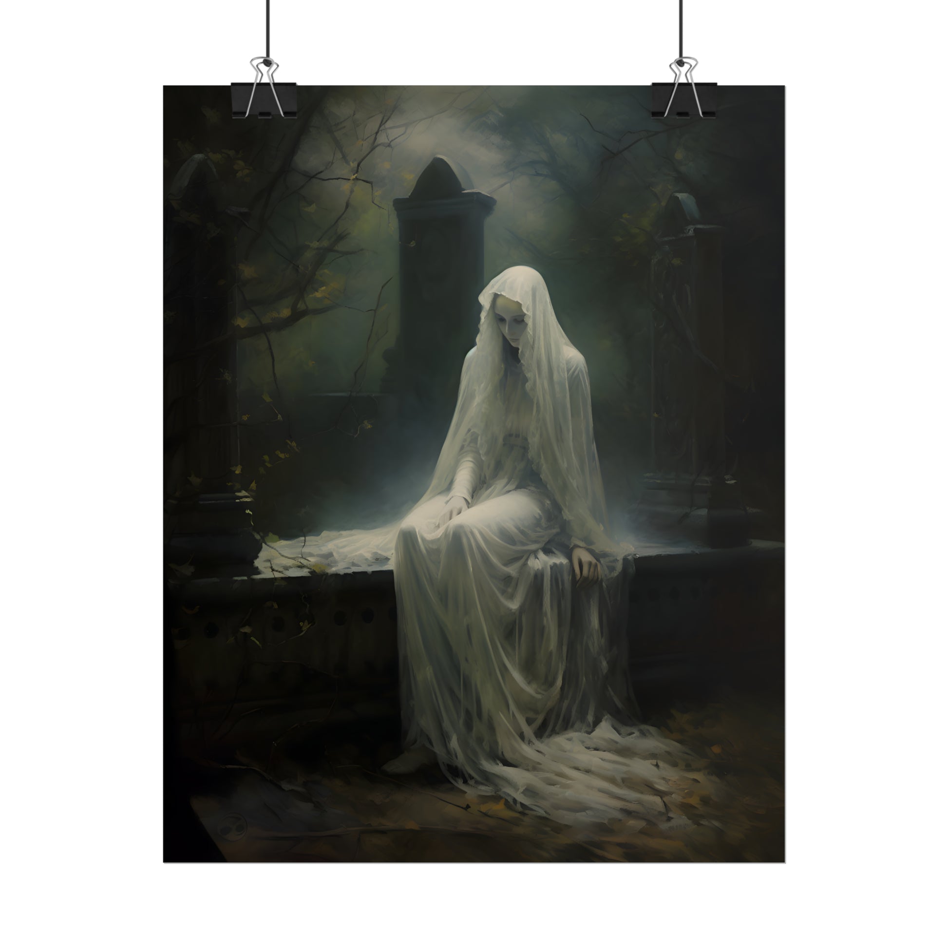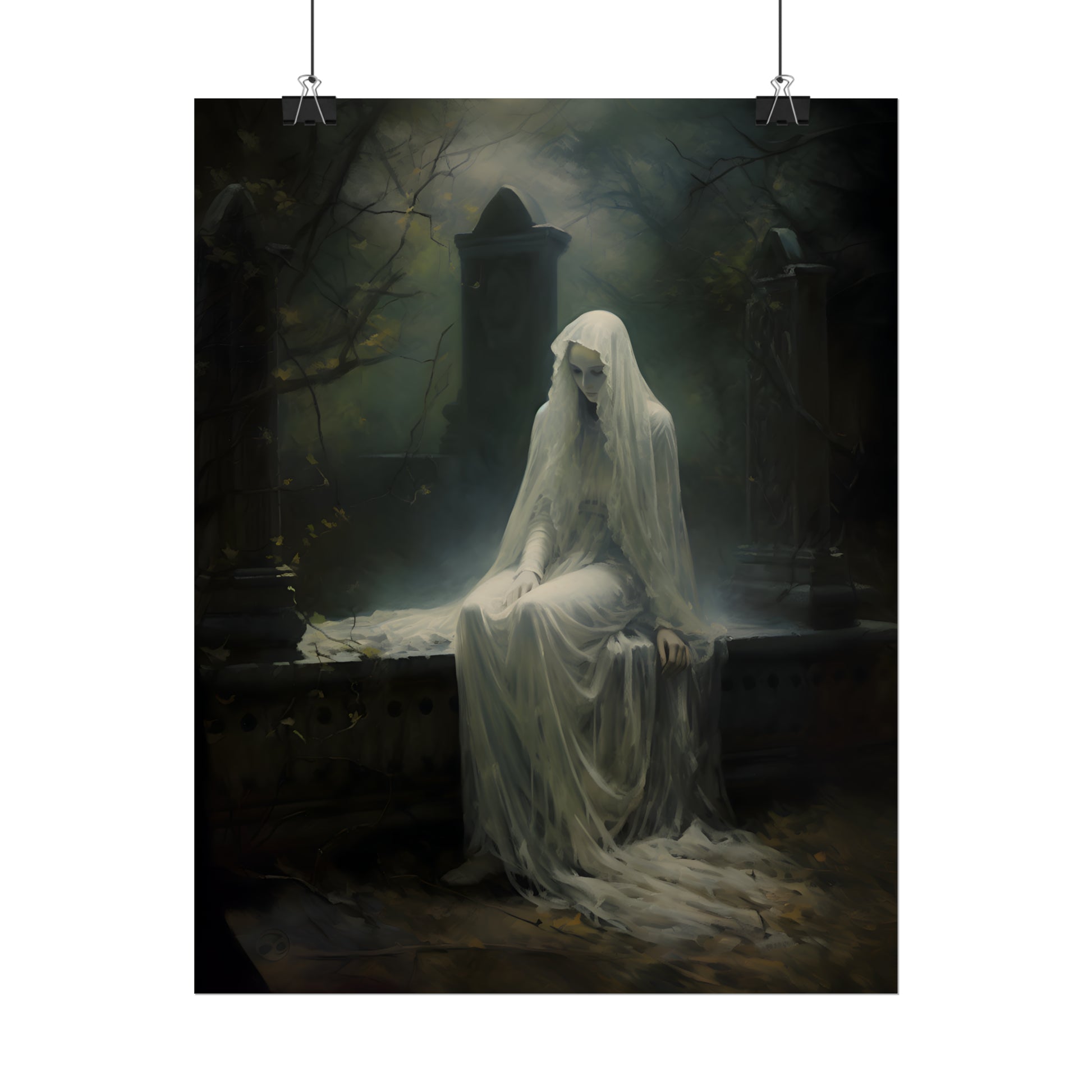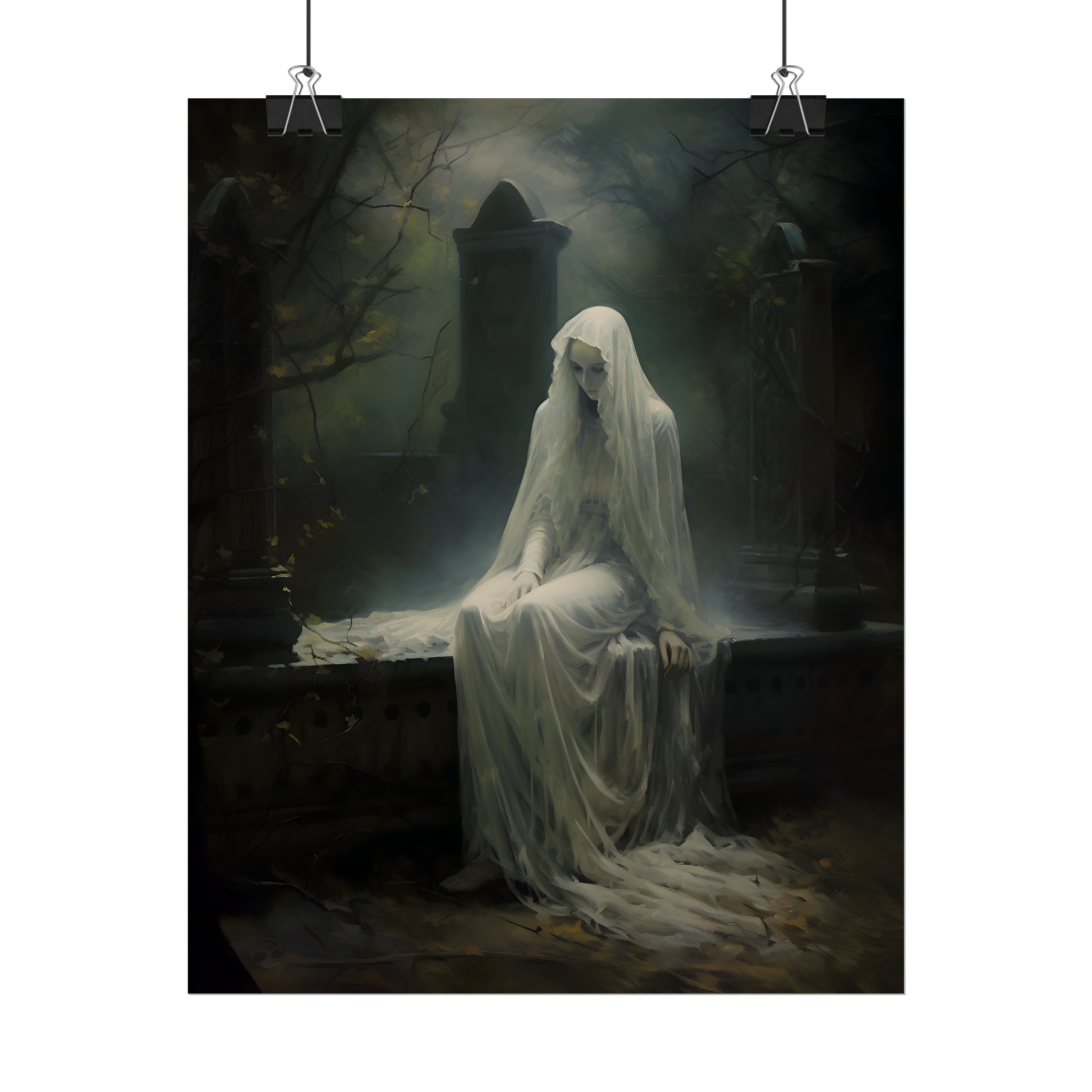 Introducing "Long Forgotten," a captivating oil painting style print that effortlessly blends mystique with melancholy. This hauntingly beautiful piece features the spirit of a woman draped in flowing white robes, exuding an ethereal glow that casts an otherworldly aura around her.