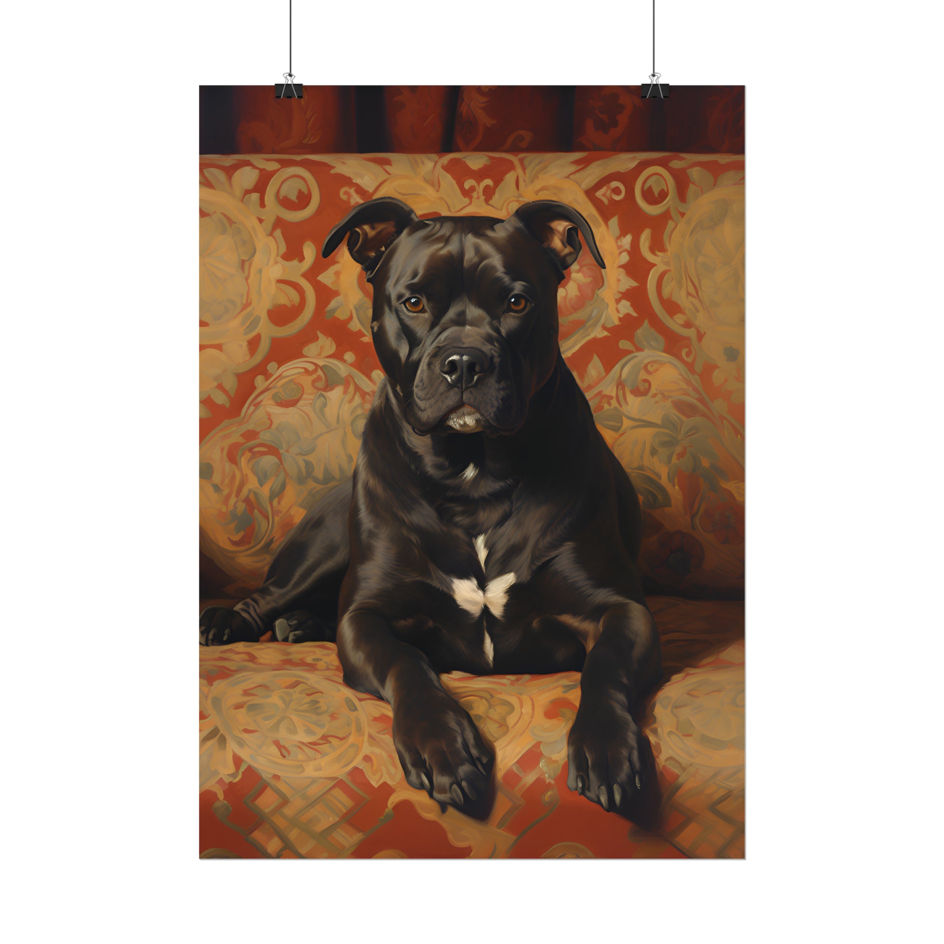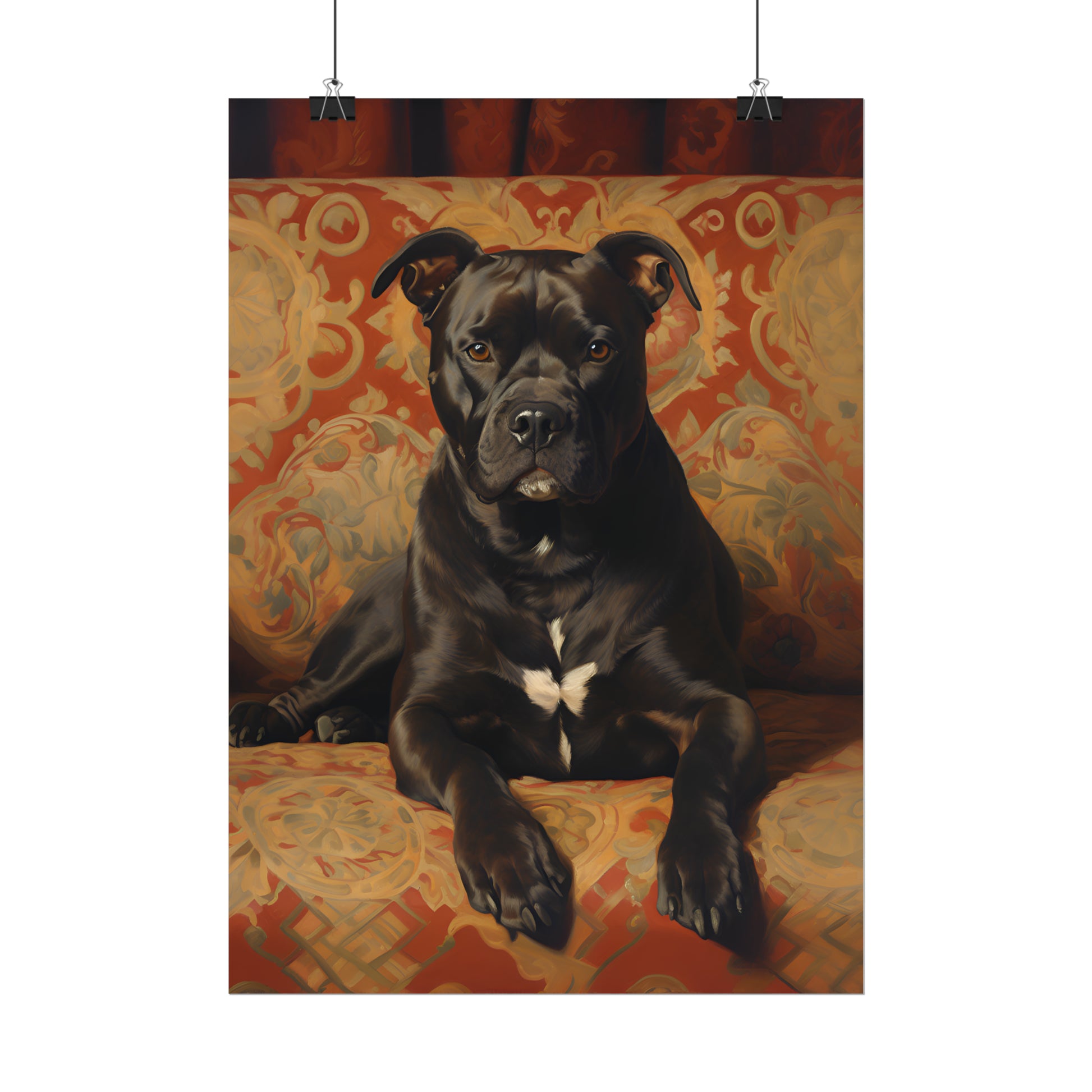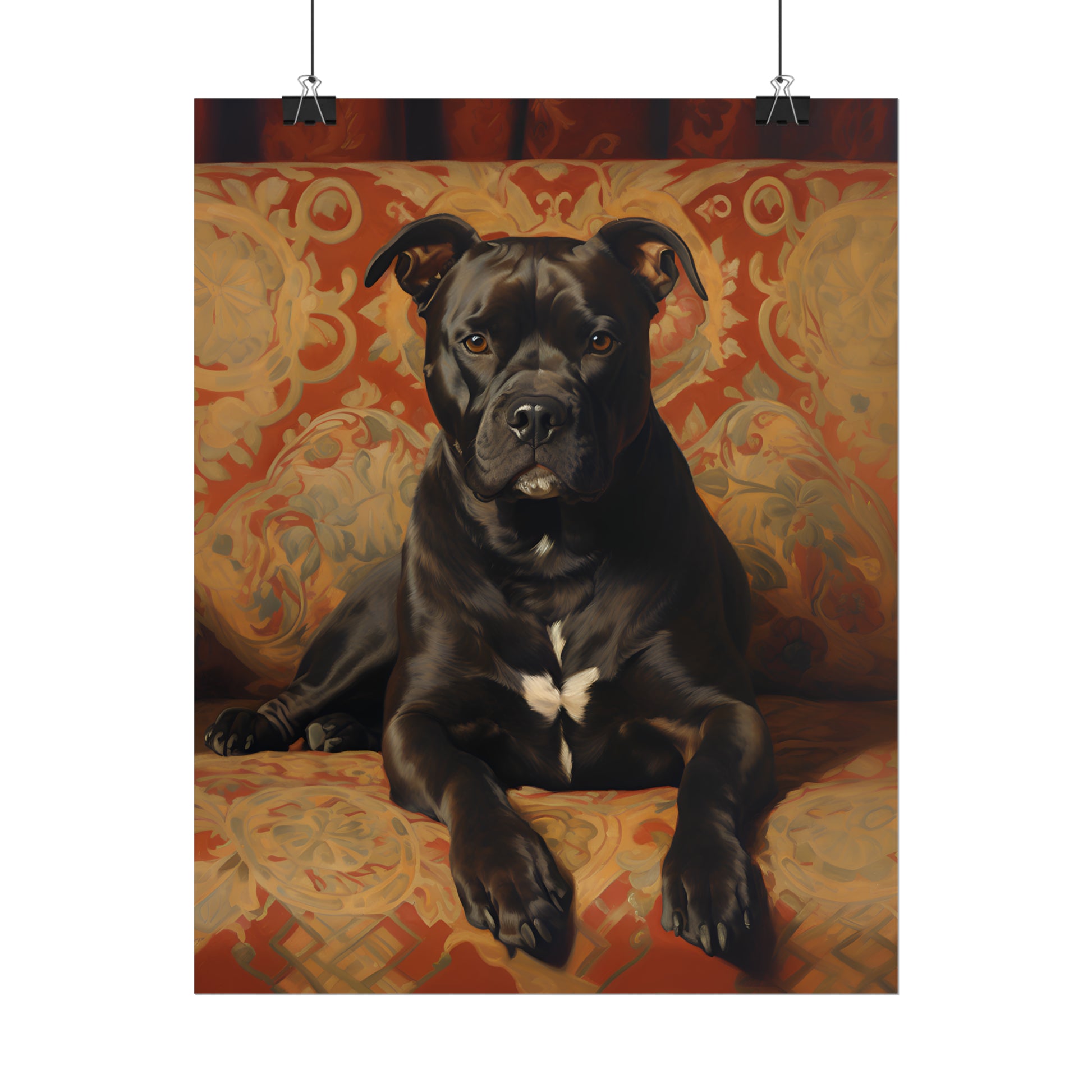 Introducing our exquisite oil painting print capturing the timeless elegance of the Staffordshire Bull Terrier in a classic and charming setting. This art piece features a magnificent black Staffordshire Bull Terrier with a distinctive white blaze on its chest, exuding a sense of strength and grace.