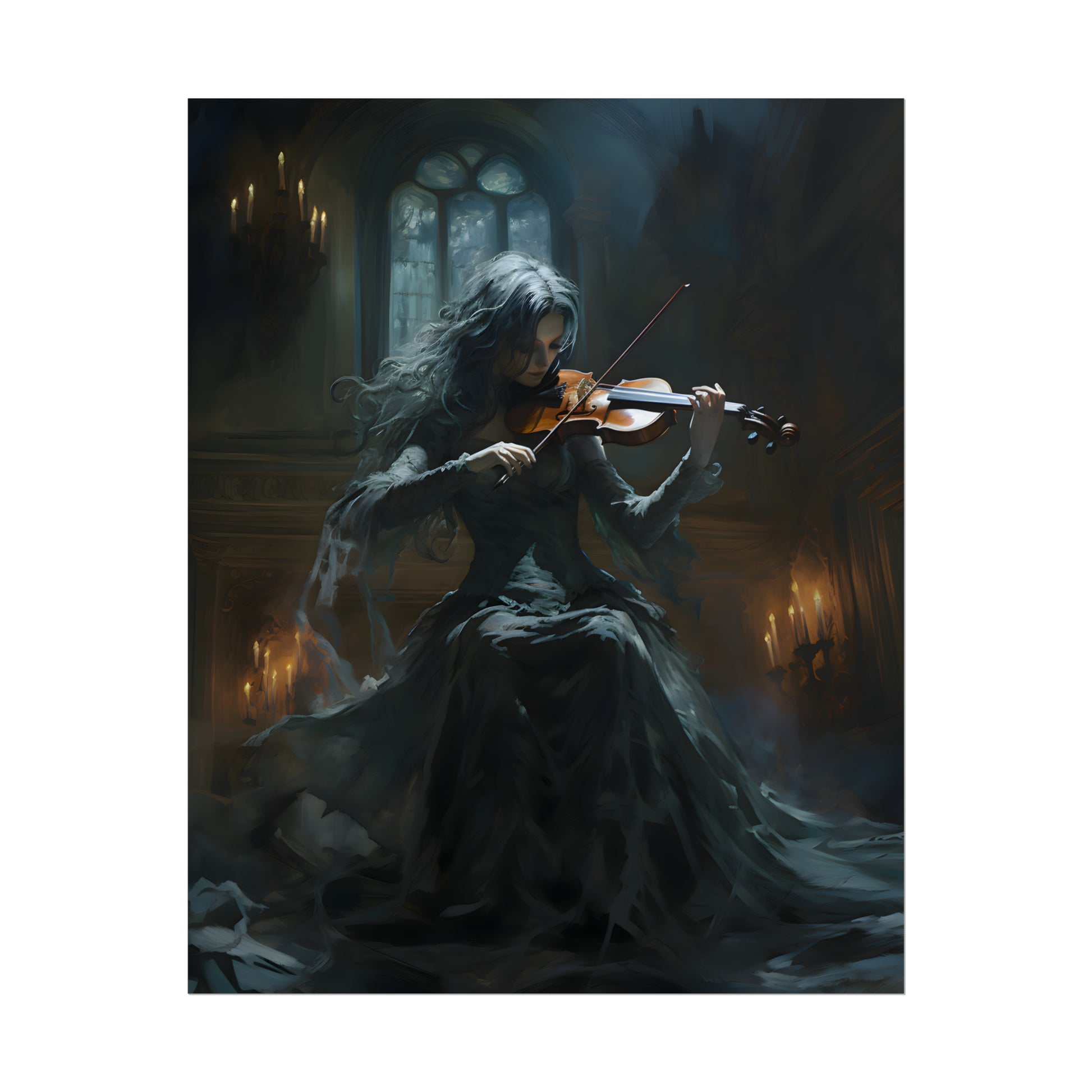 Introducing our mesmerizing "Gothic Serenade" Poster – a captivating fusion of dark elegance and haunting beauty that will transport you to a world of enchantment. This exquisite poster features a striking portrayal of a Gothic female violinist, a true embodiment of artistry and mystery.